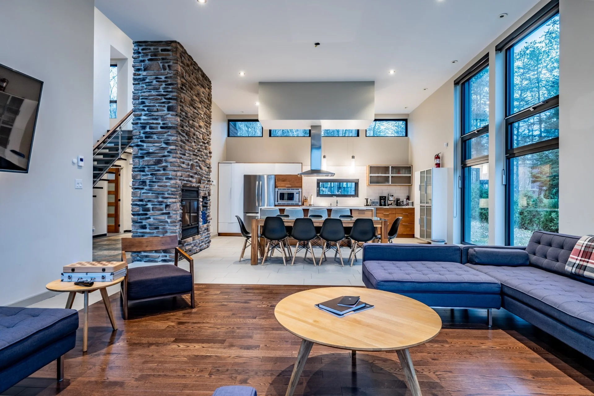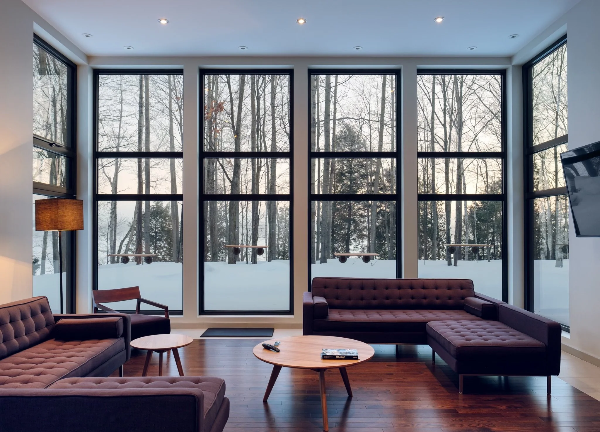Peu importe la saison, le salon demeure un espace où il fait bon se retrouver. En été, la lumière naturelle et l’ouverture sur l’extérieur invitent à profiter pleinement des journées ensoleillées, tandis qu’en hiver, l’ambiance chaleureuse en fait un refuge réconfortant après une journée au grand air. Qu’il fasse chaud ou froid, cet espace s’adapte naturellement au rythme des saisons et permet d’en profiter pleinement, toute l’année.